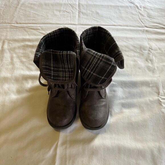 Brown faux leather boots with plaid lining Lace in the front of boot Lightly worn