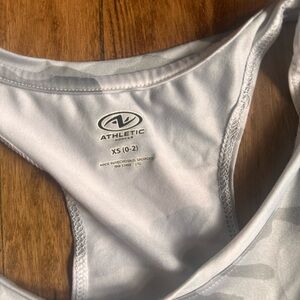 Light grey camo racerback tank top with a soft stretch fabric. Features a subtle monochrome camo print for a modern casual look. Easy-care and breathable for everyday wear.