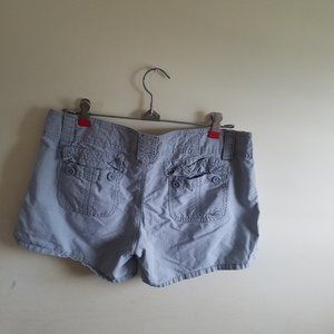 Hollister cargo shorts. They have a greyish/green/sage hue; really pretty. I love these and hate to let them go because they're so versatile!They're true to size though they fit a slimmer frame versus a voluptuous figure. Used. **These have bleach stains on the left front area on the pocket and lower seam**