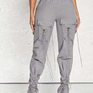 Grey Casual Womens Flap Pocket Side Drawstring Hem Cargo Pants