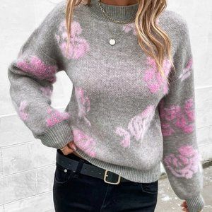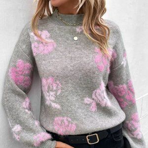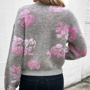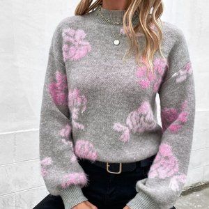 Grey Casual Womens Floral Pattern Mock Neck Drop Shoulder Sweater