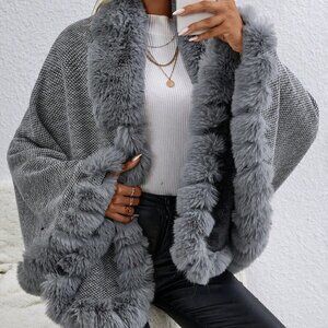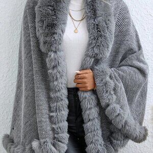 Grey Casual Womens Fuzzy Trim Cape Cardigan