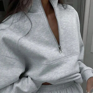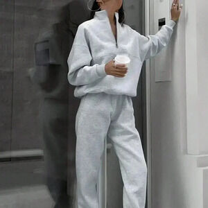 Grey Casual Women's Half Zipper Hoodie And Jogger Pants Two Piece Set