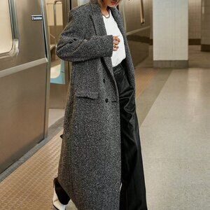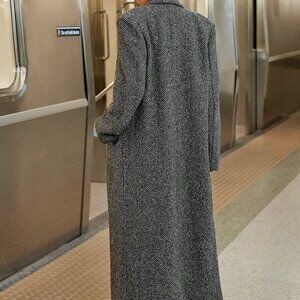This grey herringbone overcoat blends casual flair with winter-ready warmth, featuring a classic lapel collar, long regular sleeves, and a long silhouette for an oversized look. The double‑breasted button front and functional pockets add practicality, while the lined interior ensures comfort in cold weather. Ideal for everyday style, the regular‑shaped hem and timeless herringbone pattern make it a versatile addition to any cold‑season wardrobe.