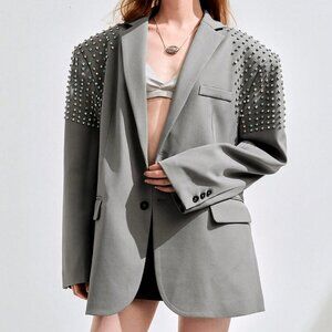 Grey Casual Women's Oversized Padded Shoulder Suit Jacket with Rhinestone Design