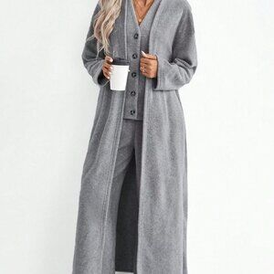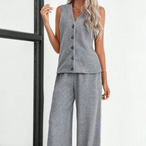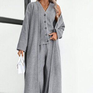 Grey Casual Women's Plush V-Neck button down vest, Cardigan & Pants set