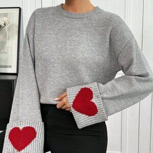Grey Casual Women's Round Neck Cuff Heart Pattern Sweater