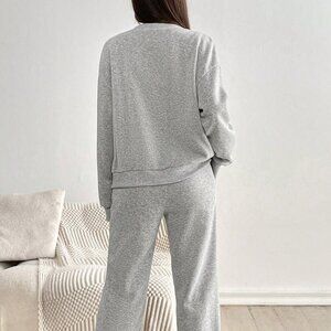 Grey Casual Women's Set Outfit V-Neck Buttoned Top With Pockets