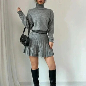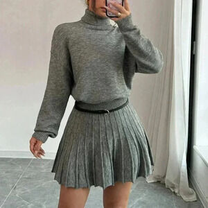 Grey Casual Women's Solid Color Loose Pleated Skirt And Turtleneck Sweater Suit
