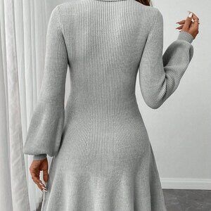 Grey Casual Women's Turtleneck Lantern Sleeve Flare Hem Sweater Dress