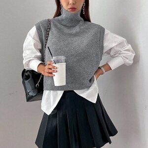 Grey Casual Womens Turtleneck Split Hem Sweater Vest