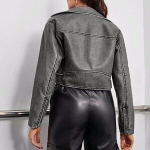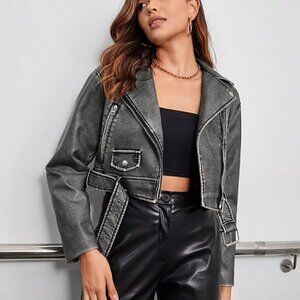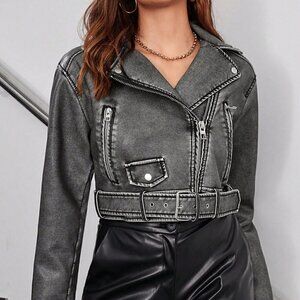 Grey Casual Womens Zip Up Belted Moto Jacket