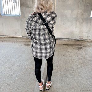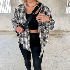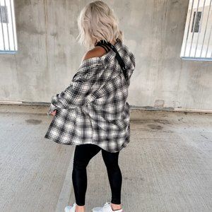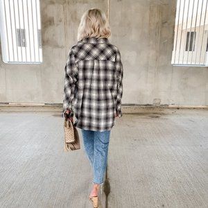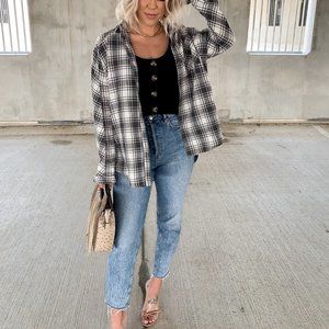 The Aspen Flannel is the perfect on trend piece to take you into Fall and Winter. Plaid in cream and grey/beige. Relaxed fit with lightweight but warm fabrication. Button down front makes the most perfect layering piece. Can be styled and worn so many different ways. Relaxed Fit