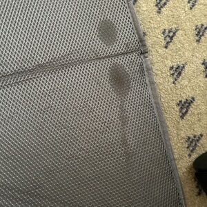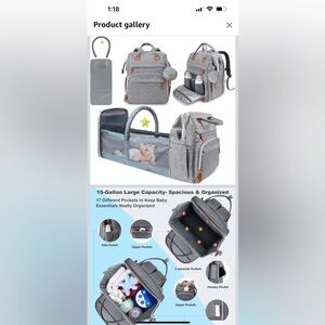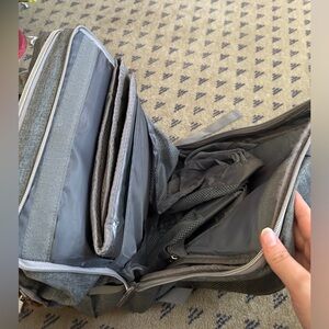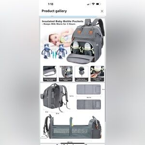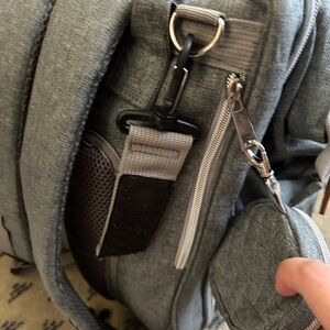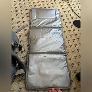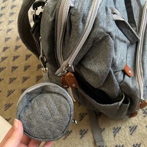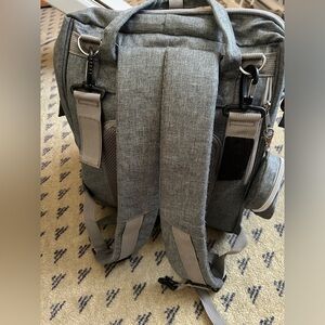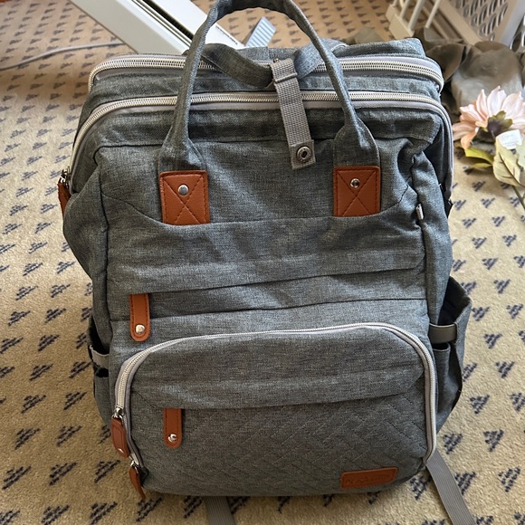 Gray diaper bag backpack in EUC. Smoke free and pet free home. There are a few small spots on the changing pad, which are shown in the photos. I also no longer have the parts to turn the back side into a changing pad/bassinet. I just used it as an extra pocket to store blankets, etc..