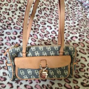 Light grey/black authentic Dooney & Bourke shoulder purse. This purse has multiple storage spaces, front pocket with clasp, zipper pocket with some black markings, pocket on the inside. Used a few times.