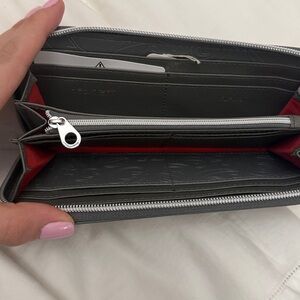 Stylish grey wallet with embossed numbers. Features a secure zip closure. Great holiday gift