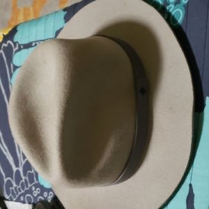 Grey fedora hat. One size, but adjustable. Grey ribbon around brim.