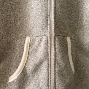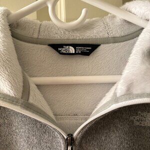 Cozy grey and white zip up form The North Face. Rarely worn so inside is super comfy and soft, and still a bright white. Hand pockets and large hood.