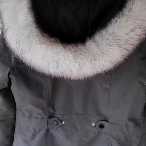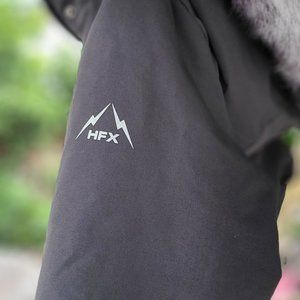 This super warm HFX winter coat is insulated, windproof, and water-resistant. Includes a white/gray faux fur trim with a removable hood. Full zip and buttons, with front zippered pockets, and warm black arm cuffs. Adjustable back buttons to cinch the waist for a sleek and tailored look.