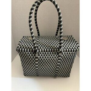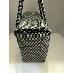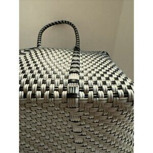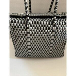 Grey Hand Woven Plastic Tote Bag Purse W/Button Close And Double Handles