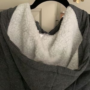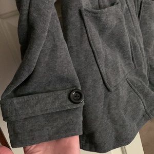 Cute and soft grey jacket with fuzzy hoodie, zips up, also pull-through buttons, sleeve buttons as well. 2 front pockets