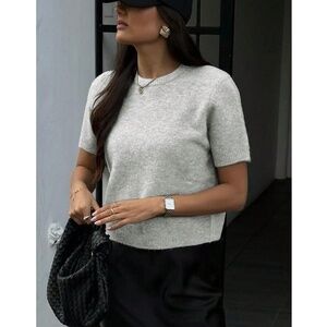 Grey Knit Sweater Top Round Neck Short Sleeve
