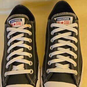 The product is a pair of Grey Leather Converse Chuck Taylor All Stars Low Top Sneakers in Men's Size 9 and Women's Size 11. These sneakers feature a lace-up closure, leather lining, and a leather upper material. They are suitable for activewear and casual occasions, with a versatile gray color and a classic sneaker style. The Converse brand and Chuck Taylor model offer comfort and durability, making these shoes a practical choice for various seasons including winter, summer, fall, and spring.