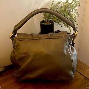Discover elegance with this beautiful soft grey leather handbag, featuring a sleek design and gold accents. Perfect for any occasion.