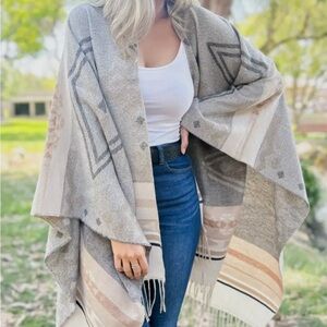 Stylish gray and cream Ruana with geometric patterns. Perfect for layering.
