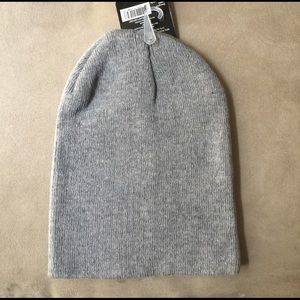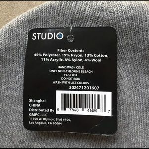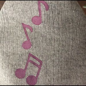Grey cold weather beanie from Studio 74. Purple music notes on the front side of the beanie.