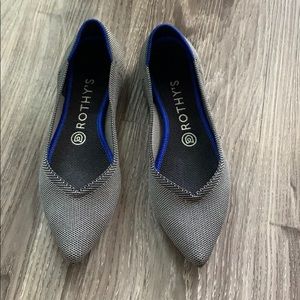 Cloud Grey Birdseye pointed toe flats by Rothys. Blue halo and black outsole. Soles can slip out. Worn once, washed once and air dried. Condition like new. Color in this size is currently sold out online.
