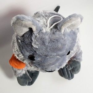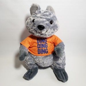 Grey Quokka plush stuffed animal that measures approximately 14-1/2" tall. Made of polyester fibers and polyurethane foam. This cute guy is soft and wears an orange shirt that says "Ding Ding Ding" on it. The shirt is attached at the back of the neck. Made by Toy Factory for Dave and Buster's restaurants.