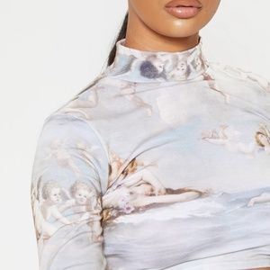 Take your off-duty look to the next level in this set. Featuring a grey material with a renaissance print design, a high neck, long sleeves and a cropped length. Team this with the matching skirt and barely-there heels for a look we are loving.