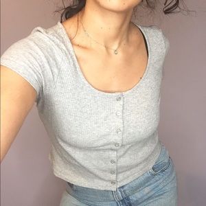 Super cute, versatile, soft grey, ribbed crop top. It has buttons all the way through, could be worn open over a bralette or tank. Looks great with high waisted jeans or skirt!