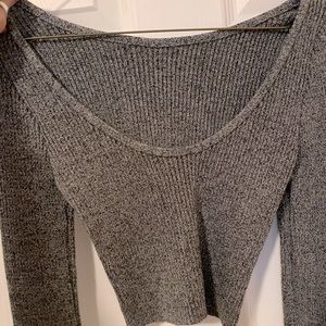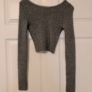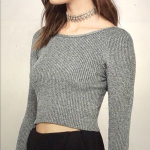 Long sleeved crop top is finished with a ribbed knit and scooped back neck.