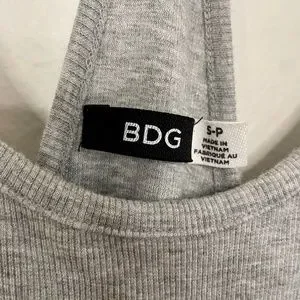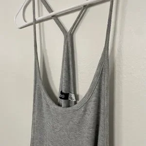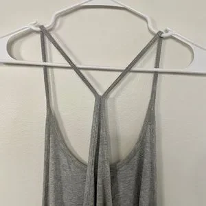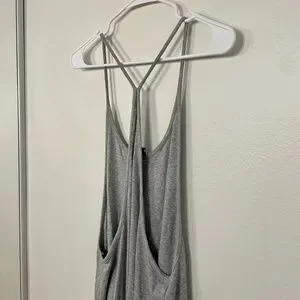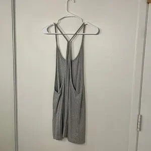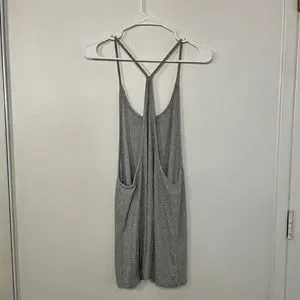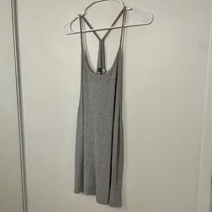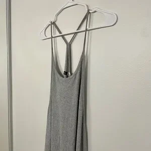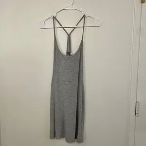 This is a grey ribbed racerback tank dress purchased from Urban Outfitters in size S. It's lightweight, soft, and flowy. Sides and back are open. Great condition, lightly worn.