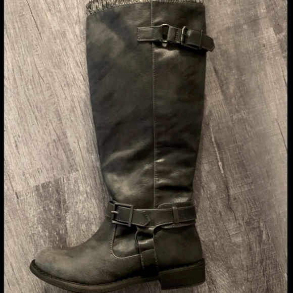 Talisa brand, Dark Gray Sweater lined Riding Boots with zippers on the inside of the boot. These say that they are a size 6, but I want to warn anyone before they purchase that they run a little on the small side. I wear a size 6 and these definitely are not that. I couldn't even get my feet all the way in them to wear them so they are still brand new without tags. Great pair of riding boots for an older child or a lady with a size 5 shoe size... lol. Thanks for checking out my closet!