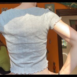 Adorable, thin and breathable grey crop top! Has ruffles bordering the edges of the bottom and sleeves. Casual or for an event, it’s a perfect top to pair with any sort of bottoms :)