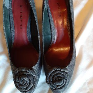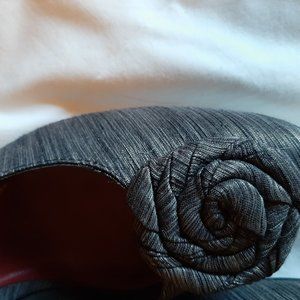 Cute grey pumps made from a tweed silk. An added rosette on the toe gives them a retro look. 2-inch low heel. Lightly worn and in great condition.