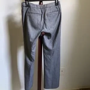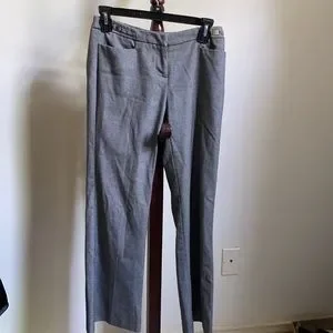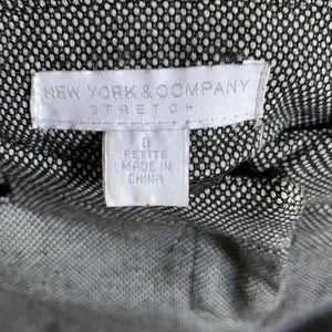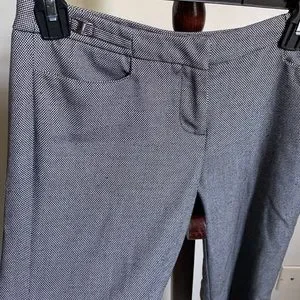 These are New York and Company stretch petite slacks in a black and white pattern in a size 0. The black and white patterns makes the slacks look a nice grey from a longer distance. A boot flare helps to add attention and recognition to the wearer. There are two front pockets, as well as two back pockets. These slacks are about 36” long.