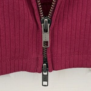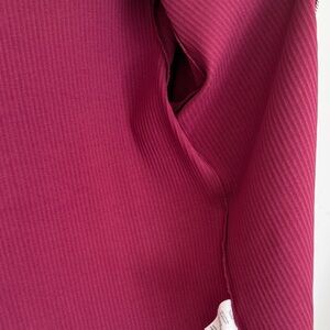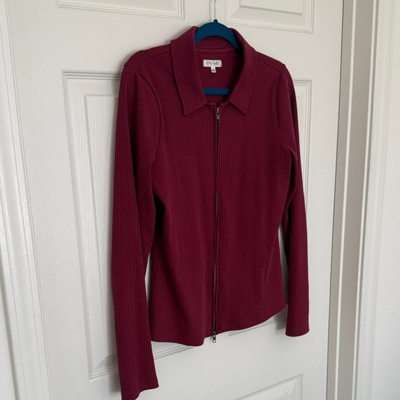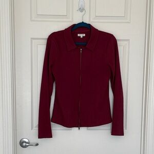Chic deep red jacket with ribbed texture. Ideal for casual wear.