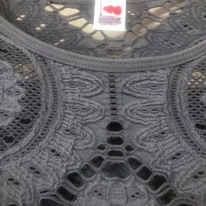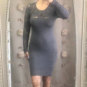 Grey long sleeve very form fitting, very stretchy dress. Open Peek-a-boo pattern across the top and on the arms. Great going out dress. 90% nylon 10% spandex. Size on label is M/L but this dress fits a small or xs. Never worn