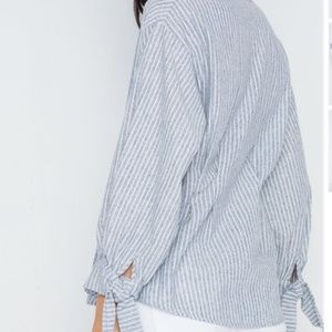 Grey Strip Long sleeves with self tie cuffs, stripe pattern allover, dropped shoulders, button down closure, pleated at waist, unlined