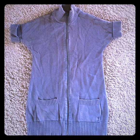 Zipper 3/4 length sweater. Short sleeves with ribbed arms and waist. Worn several times with wear shown and small spot shown