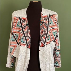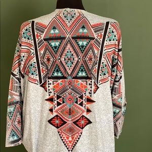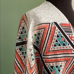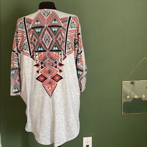 Grey sweater with tribal accents. Longer in the back. The sleeve hits the elbow.