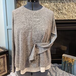 Timeless and soft grey sweater with off-white chiffon layer underneath that flows from back and bottom. Crew neck accompanied by a chiffon tie on the back.