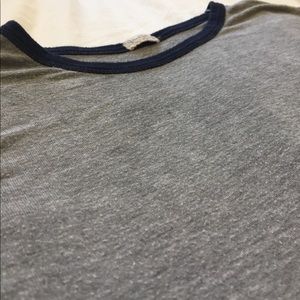 This is a grey tshirt with a navy blue trim . It's very soft and plain.