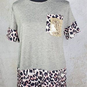 Grey T-shirt with Leopard and Sequin Pocket