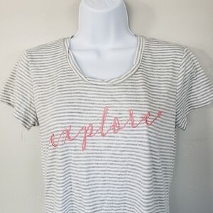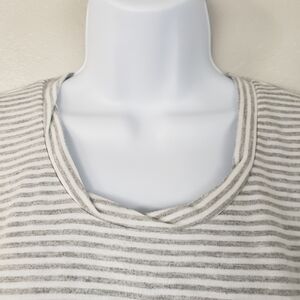 Grey and white striped. Short sleeve. Asymmetrical hem down the bottom. Longer, almost tunic length. Twisted hem around the neck - very cool!