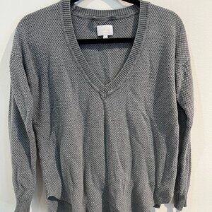 Wilfred grey V-neck sweater. Size small (runs oversized). Knit is made of 55% silk, 40% cotton and 5% cashmere. Sweater hits around the hits (longer) and has curved hem. Condition is good (wrinkled in photos from storage but would improve with steaming)